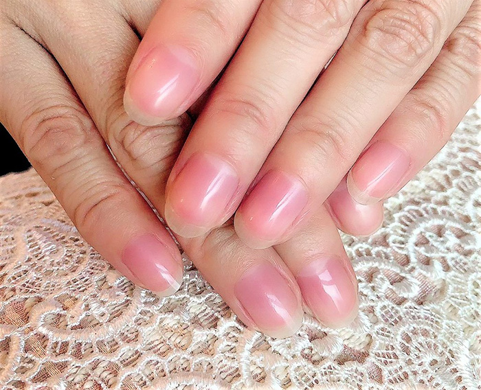 偽爪ではなく、本物自分爪。 透明感と血色で、ときめくピンクダイヤモンドの仕上がり。フレンチネイルもジェラシー。